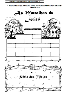 RECURSOS NECESSÁRIOS: Conquistando a atenção: chapéus de jornal (dobradura); Lição: caixas encapadas com papel pardo, plaquinha de papel com o nome Jericó, casa de brinquedo para ser colocada sobre o muro, cordão vermelho, arca do concerto, trombetas, roupas dos tempos bíblicos (especialmente de sacerdotes), chapéus (dobradura em jornal); Memorizando: muralha de caixinhas de fósforo ou pilha de copos descartáveis; Revisando: cópias das figuras abaixo; placa de metal, imãs; Aplicando: oito cópias da figura da muralha (parte A, do jogo); Contando aos Outros: Opção 1: peças para montar uma muralha (biscoitos, peças de monta-monta, caixas de fósforo encapadas, etc.), saquinho, fitilho; Opção 2: duas cópias das mesmas atividades de Revisando para cada criança, lápis de cor.